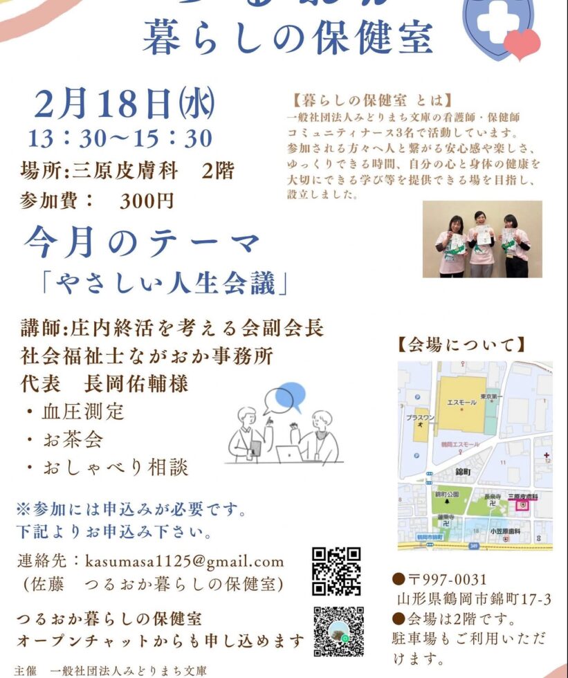 ちょっと遅くなってしまいましたが、2月18日13時30分〜15時30分の予定で、鶴岡市三原皮膚科2階を会場に「つるおか暮らしの保健室」にて人生会議についてお話しさせていただきます。